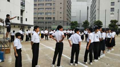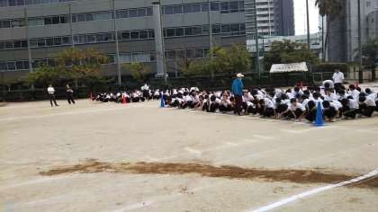 今日の6限目は、グランドで縦割り応援の練習です。