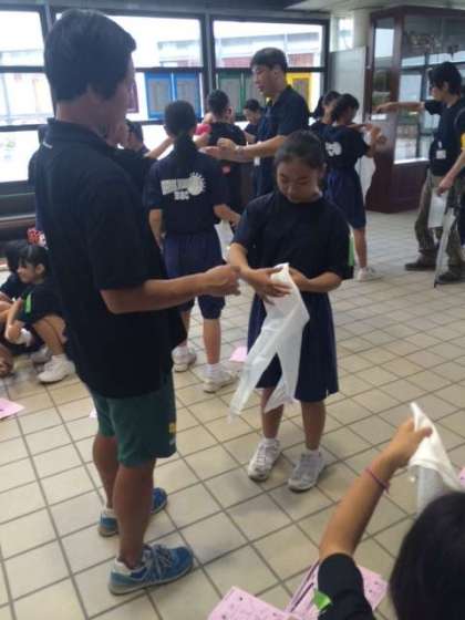 三角巾で包帯を作っています。