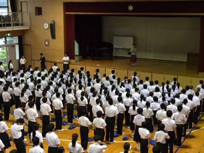 本日、全校集会が開かれました。雨のため体育大会予行は明日に延期になってしましましたが、この間取り組んでいる校歌の練習がありました。体育大会まてあと4日、着実に上達しています!