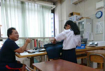 明日の時間割や持ち物を先生と確認しています。