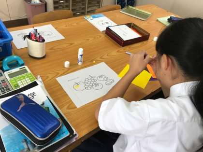 ちぎり絵をしている様子です。秋の果物の下絵に色紙を細かくちぎって貼り付けています。
