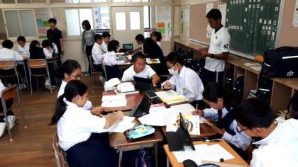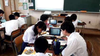 数学科の福山先生の授業では、方程式の単元で班ごとで、問題を作成し、解くことから深い学びにつなげるとともに、デジタル教科書やタブレット機器を活用し、より数学に対する興味・関心を高める点を生かし、苦手意識を軽減し、楽しさを感じることを意図した授業に取り組んでいます。