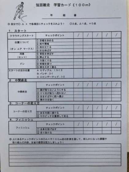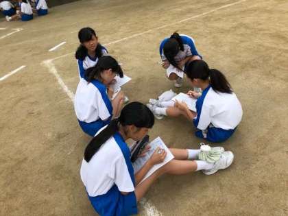 4時間目の1年3・4組の体育では、班ごとにワークシートを活用して短距離走(100m走)に取り組んでいます。スタート、中間疾走、コーナー、フィニッシュの各局面の観点をお互いにチェックしながら課題克服を目指しています。身体を動かすだけではなく、自らの技能について考えたり、お互いにアドバイスしたりすることが運動技能の向上には必要だということも学習してほしいと思います。頑張れ1年生!