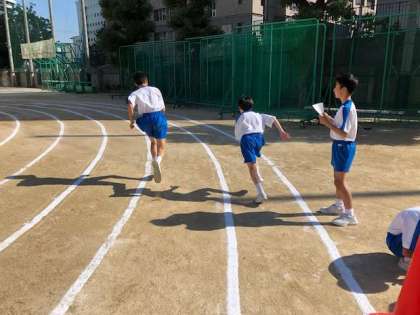 本時の授業内容は、100m走の観点チェックです。班ごとにワークシートを活用し相互チェックと教え合いをしながら技能の向上を目指します。積極的に取り組んでいます。頑張れ1年生!