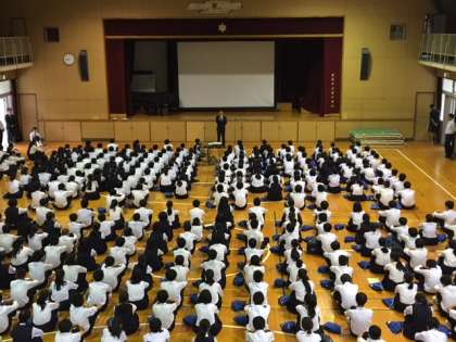 西垣先生、校長先生からお話があり、その後に創立30周年記念プロモーションDVDを鑑賞しました。