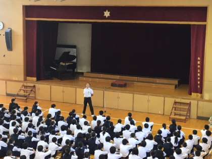 校長先生からは、総合文化祭で活躍した皆さんへの労いの言葉がありました。また、週末に迫った、創立30周年記念式典へ向けて、この節目に、東中に在籍し、式典に参列することに、誇りと自覚を持ってほしい。一人一人が努力を重ね、熱い心を持って、臨んでほしいい。「誇りを胸に受け継げ東」は、皆さんの合言葉ですが、先輩方から脈々と受け継がれてきたものです。先輩方の東中への思いや皆さんに託されたことを、この式典で披露していきます。その瞬間に立ち合うことへ自覚と責任を持って当日を迎えてください。