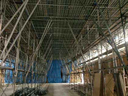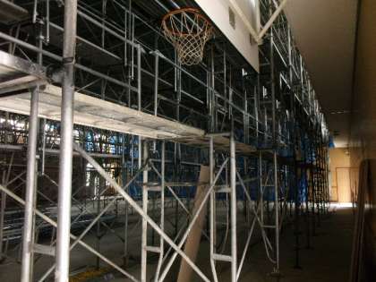 7月1日から始まった体育館の吊天井耐震改修工事も、吊天井の撤去作業も終わり、天井全体が下地のコンクリート姿に! 本日業者と天井の塗装色の打ち合わせがあり、明日以降、塗装作業が始まります。一日も早く工事が終了し、体育館が使用できるようになればと願っています。