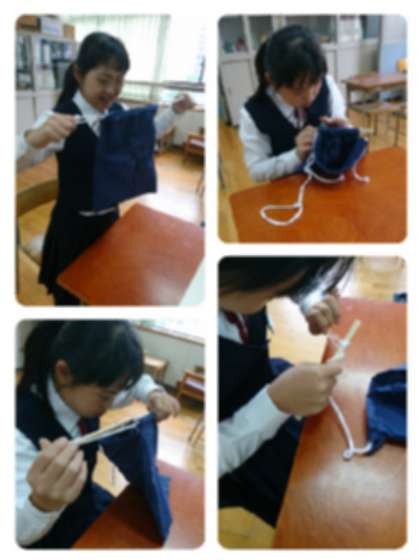 家庭科の時間につくっている「きんちゃく袋」に、紐を通しました。紐通しは使いにくいため、割りばしを使って、紐を通しました。「できたー!」と嬉しそうな表情です。