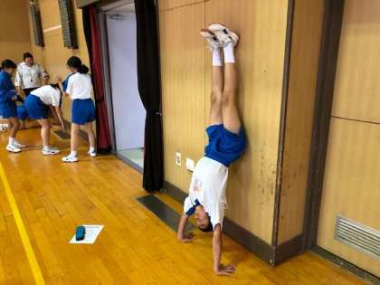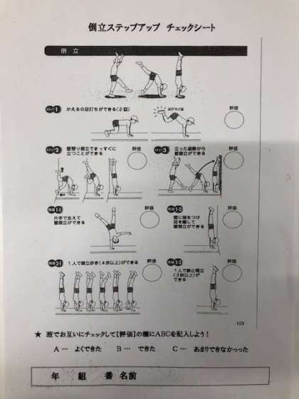 「倒立ステップアップチェックシート」を活用して各ステップを確認しながら倒立の練習をしています。