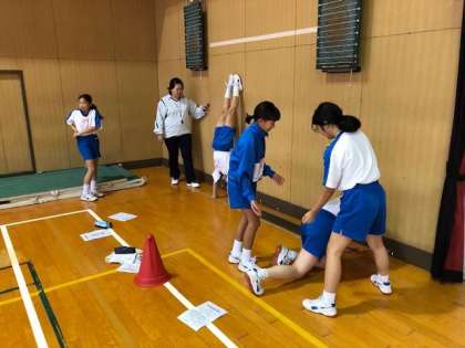 今日の5組の授業では、基本技能となる倒立を学習しました。