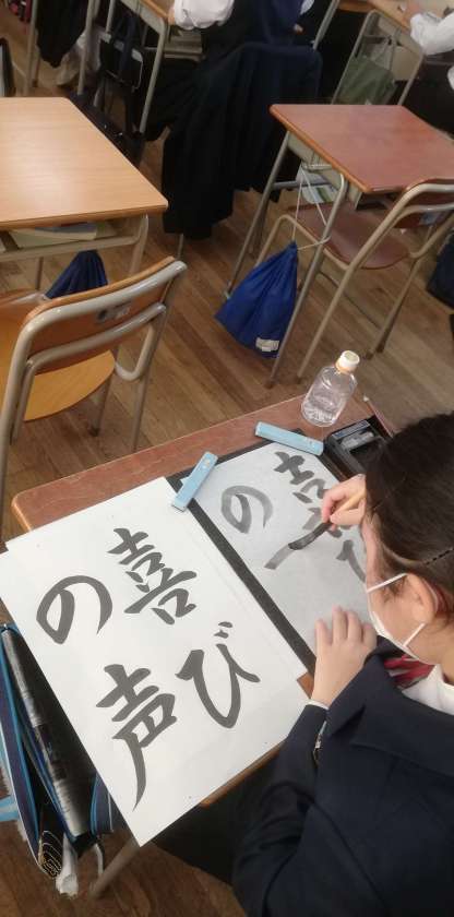 毛筆を用い、書写をしています。「書写」とは「書き写す」こと。お手本を見て、丁寧に書き写しています。