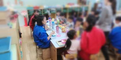 園児と昼食をとっています。