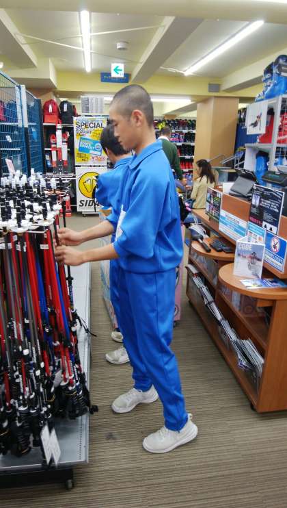 スキーを主に取り扱うお店で、生徒たちはスキーストックを陳列しています。