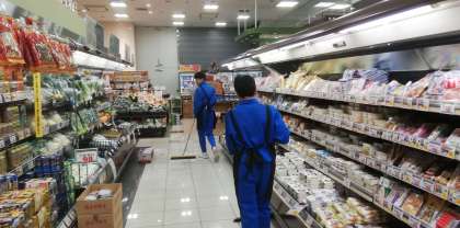 挨拶の声出し練習、そして店内の清掃です。