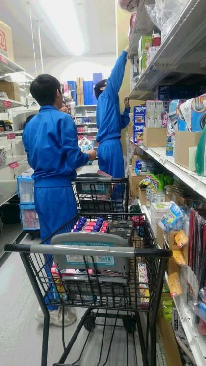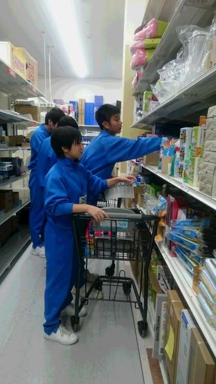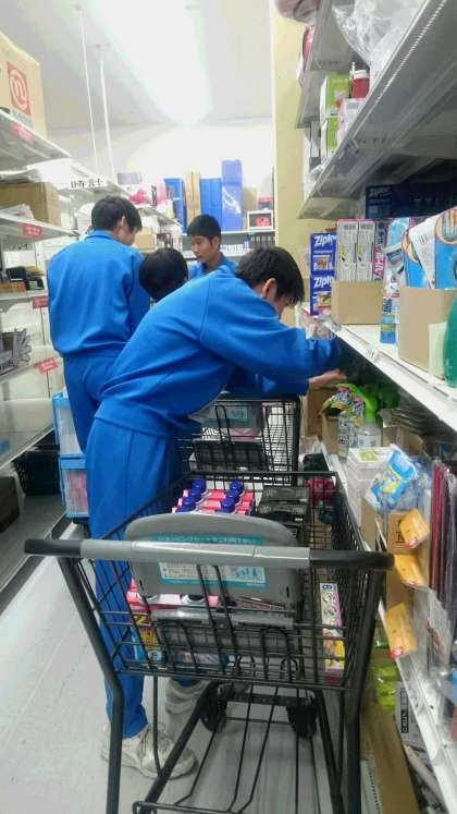 生活用品の棚出しをします。みんなで協力して頑張っています!