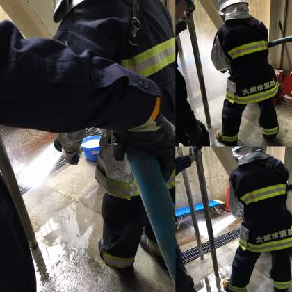 消防車からホースを運んでの放水訓練です。