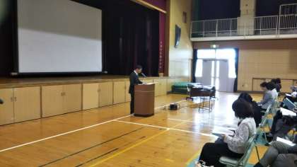高校の校長先生の進路講話の後、本校の進路指導主事の金田先生から、奨学金の話を始め、これからの進路に向けての話がありました。