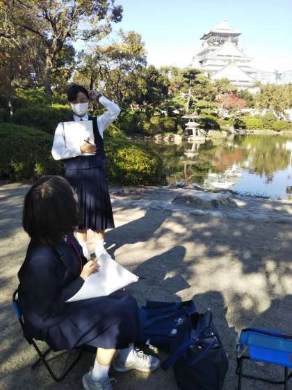 天気が良かったので池に映る様子や、掘の流れを気に入って描いている生徒もいました。