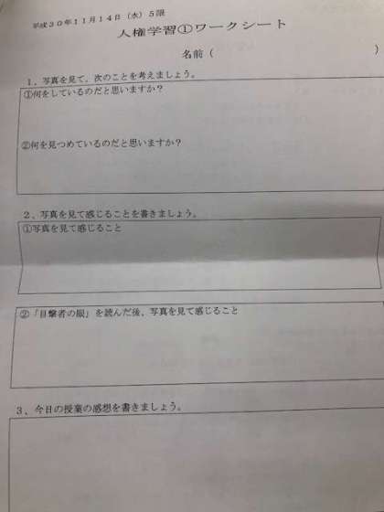 内容は、アメリカ人の写真家ジョー・オダネルの撮影した「目撃者の眼」を写真とインタビュー記事を見て、原子爆弾の恐ろしさや痛ましさについて考え、改めて戦争を起こしてはいけないということを再認識できた授業でした。