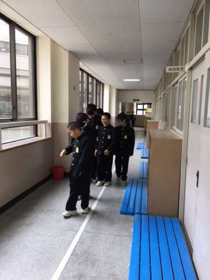 ペアになってアイマスクをつけた人を手引きして、2階被服室から第3階段に向かってます。