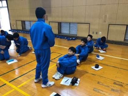 班長が掲示してある各技の観点を確認し、整列している班員に伝え練習が始まります。