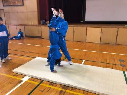 今は側方倒立回転、前方倒立回転、倒立ブリッジ、伸しつ後転などの高度な技をグループ学習しています。