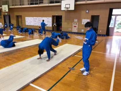 本日も、1時間目から1年1・2組はマット運動に取り組んでいます。