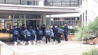 東中生が元気にあいさつしながら、登校しています。まもなく、全校集会です。