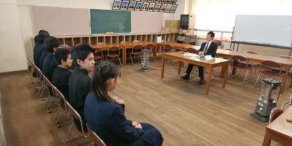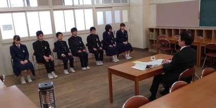 校長先生の質問に対して、中学校生活の印象に残っている行事や後悔したことを将来の夢にどのように結びつけていくか、しっかりと話しています。