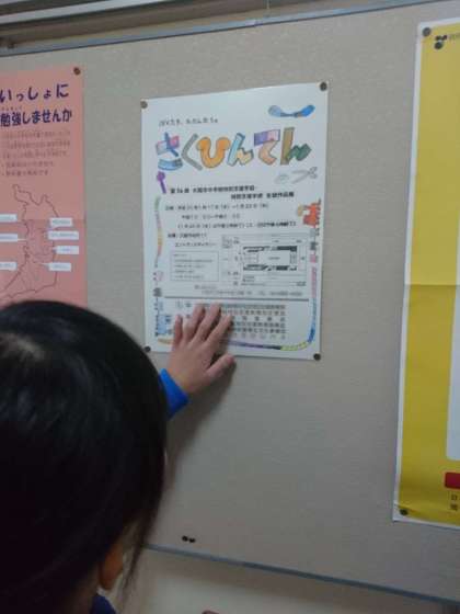 先週、色を縫った作品展ポスターをラミネート加工し、掲示しています!