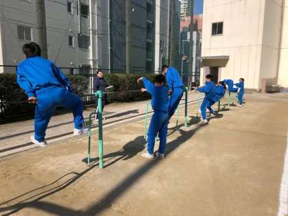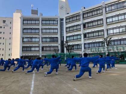 本日も寒さが厳しいですが、4時間目には1年1・2組が元気にグラウンドで体育に取り組みました。