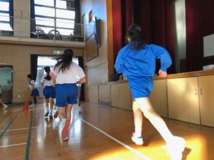 1時間目は1年1・2組の体育です。冬休みに入るまでに持久走に取り組みました。今日は体育館内で6分間走にチャレンジしました。