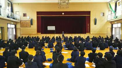 小野先生からは2学期の振り返りと3学期、卒業に向けてのお話がありました。また、冬休みには受験に向けて当日利用する交通機関を使って希望する高校見学もしておきましょう。願書も必要ですので、準備をお願いします。
