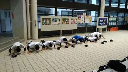 もともと大阪城へ行き、駅伝大会に向けての練習をする予定でしたが、あいにくの雨ですので、校舎の中で練習しています。