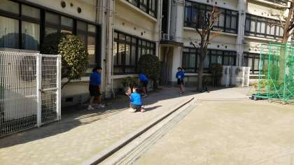 練習前にグランド脇でウォーミングアップをしています!