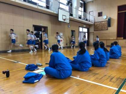 授業初日ですが、2年5組は元気に体育館で6分間走にチャレンジしています。