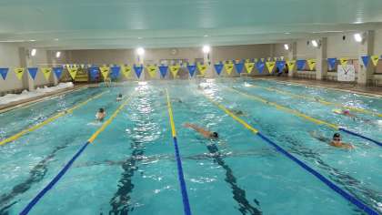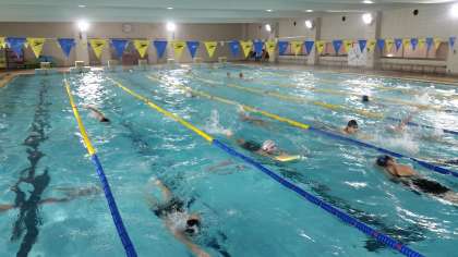 本日は、朝から高校の温水プールをお借りして、3校合同練習を行っています。初泳ぎですが、頑張っています。