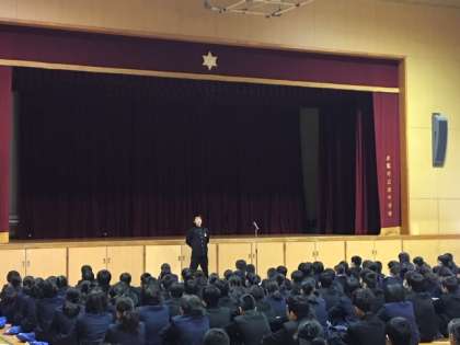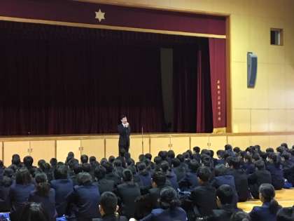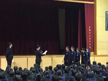 校長先生からは、3連休中に各部活動で大会や公式戦での頑張りに触れられるとともに、高等学校や大学での全国大会で、大阪代表校の活躍について、その輝かしい結果は大阪の中学校部活動の頑張りや成果が基礎になっている。皆さんが大阪の高等学校や大学のチームを支えている。今の皆さんの頑張りこそが次の大きな目標や夢に繋がっている。というお話。次に昨日は成人の日で各地域では「成人式」が開催されました。皆さんの先輩である第26期生の皆さんが成人式を迎えられました。東中生の皆さんは、成人年齢が18歳と法制化されたことから、18歳で成人式を迎えることになるかもしれません。どんな成人になっていくのか、今の自分が作っていきます。