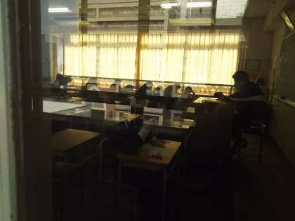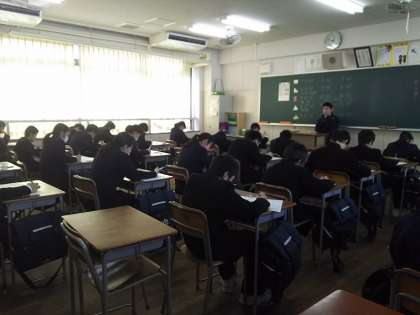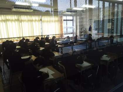 午前中に国数英のテストを終え、昼食を済ませ、午後からのテストに取り組んでいます。4限は理科、5限は社会です。