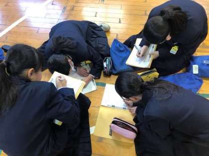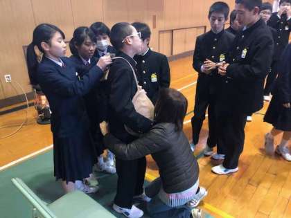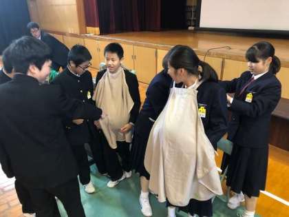 妊婦体験では、実際に重たいお腹を体験して驚きの声が上がっています。