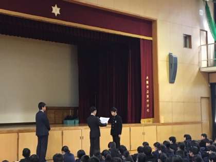 今日の全校集会では、表彰状の伝達と部活動部長会議からの連絡、そして校長先生からのお話がありました。