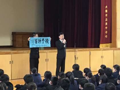 剣道部が使用する面タオルに校長先生が書いた『百折不撓』という言葉を胸に、これからも頑張りましょう!