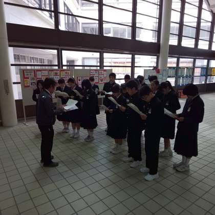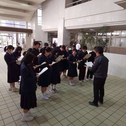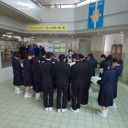 玄関ホールでは昼休みの時間を活用して、西垣先生の指導のもと部活動部長会議が行われています。
