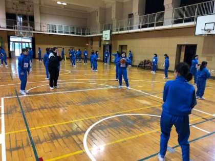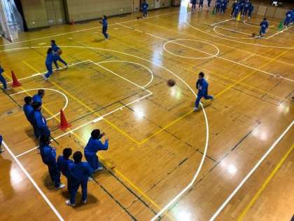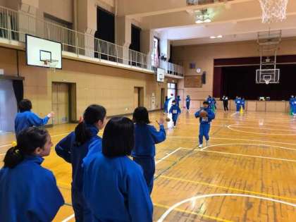 持久走の次はバスケットボールを学習しています。今日の1年3・4組は班ごとにパスとドリブルを学習しました。頑張れ1年生!
