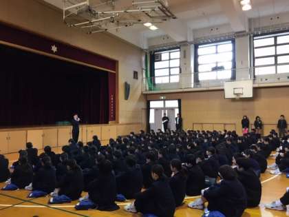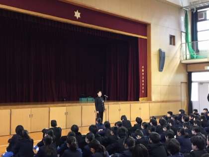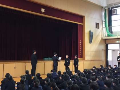 その後、校長先生からのお話です。3年生は卒業証書授与式まで1ヶ月を切りました。1,2年生は修了式まで1ヶ月余りです。いよいよ今年度の大詰めを向かえています。学年行事もほぼ終わり、残すのは卒業証書授与式に向けた取り組みです。学校行事の中で最も重要で1番の大きい行事です。3年生はもちろんこと、送り出す側の1,2年生の皆さんはしっかりと役割を果たしてください。