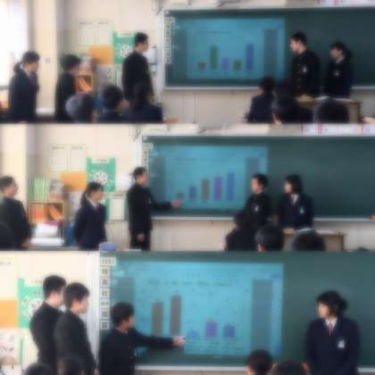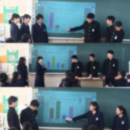 その結果を各班で集計し、グラフと発表原稿を作成しました。発表原稿では、たくさんの比較表現を用いました。