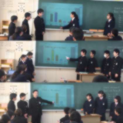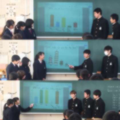 自分たちで質問文を考えたので、結果に興味津々で、集計からグラフ作成、発表原稿作成まで、どの班も協力して、熱心に取り組めていました。