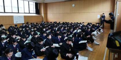 進路指導主事の金田先生のお話を真剣に聞いています。