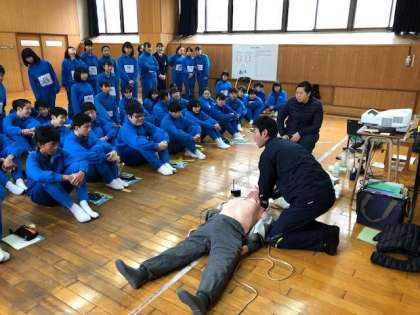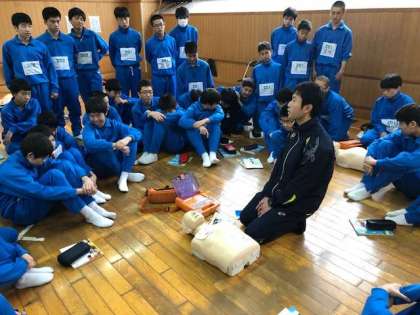 消防署からお借りした器具を使用して胸骨圧迫やAEDの使用方法を学習し、班ごとに実習を行います。