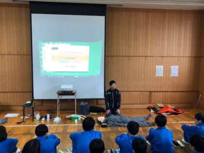 4時間目の多目的室では、2年生の保健分野で救急救命実習が行われています。